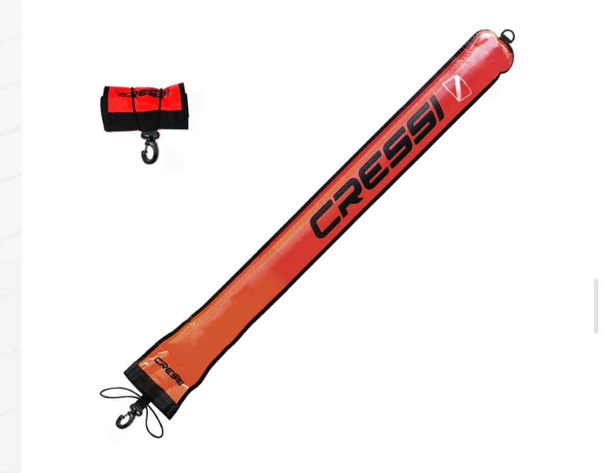 goma elástica | Inflado mediante el regulador desde la zona inferior | Base plomada para mantener la verticalidad | Color naranja de gran visibilidad | Mosquetón ABS. |Dimensiones: 120 x 15 cm.